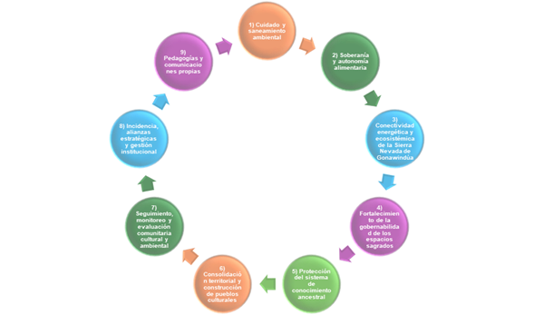 Construir y desarrollar estrategias de cuido, conservación, restauración y protección integral del Territorio Ancestral de la Línea Negra de los cuatro pueblos de la Sierra Nevada de Gonawindúa, articulado con los planes de vida, instrumentos propios, el ordenamiento ancestral del territorio y la Ley de Origen que permitan la restauración, conservación y armonía con la biodiversidad, la conectividad ecosistémica y espiritual, la generación de sostenibilidad social, ecológica y ambiental en el territorio, bajo el respeto de los derechos ancestrales y colectivos.