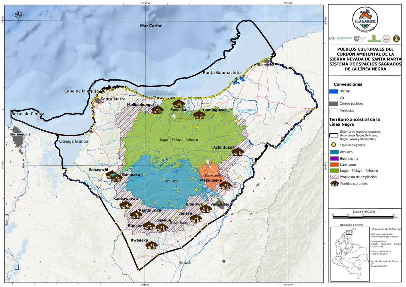 Los espacios sagrados, situados en distintos puntos de la Sierra Nevada y el resto del mundo e interconectados desde la Línea Negra, generalmente se encuentran ubicados en los nacimientos y desembocaduras de los ríos, en los cerros, las lagunas, en cuevas, rocas, árboles y otros paisajes y/o elementos, incluyendo lugares en el mar; cada uno de los espacios y sitios sagrados, se constituyen en los medios a través de los cuales se hace posible la consulta con los Padres y Madres espirituales de todo elemento natural y humano; seres espirituales que dictan los códigos o normas de uso, manejo, administración y reglamentación de estos componentes, dimensiones, elementos e interconexiones del territorio y del ambiente. En nuestro territorio ancestral tenemos los espacios y sitios sagrados que representan y contienen todo lo que existe en la naturaleza: en diferentes objetos y sitios sagrados están los demás territorios, los animales, plantas, minerales y todo elemento que hay allá en otros lugares, y desde estos espacios llegamos conectándonos espiritualmente para pagar, curar, reparar y alimentar esos lugares. (Consejo Territorial de Cabildos – CTC, 2015, p. 25)